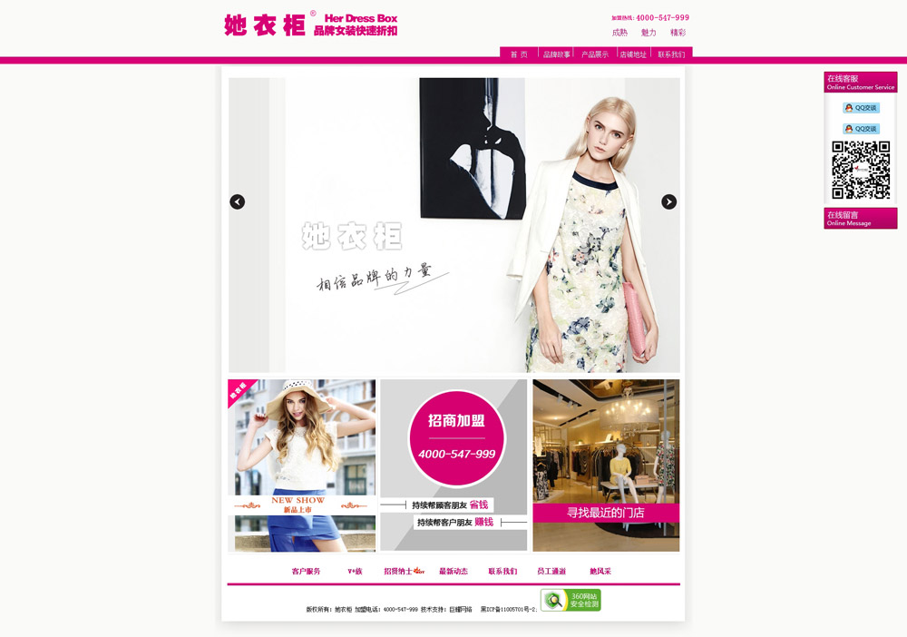 公司旗下有“三份優(yōu)依”,“衣宴”,“她衣柜”和“她衣庫(kù)”四個(gè)店鋪品牌。經(jīng)過(guò)近十年的務(wù)實(shí)發(fā)展,已經(jīng)在全國(guó)開設(shè)直營(yíng)家170余家,加盟店260余家,而且每天都在持續(xù)增長(zhǎng)中,“她衣柜”目前已經(jīng)成為中國(guó)本土折扣行業(yè)最強(qiáng)、最大的品牌女裝折扣連鎖中心,我們有著遠(yuǎn)大的目標(biāo):致力于打造雙百(100億、100年)企業(yè)是“她衣柜”不懈的追求。